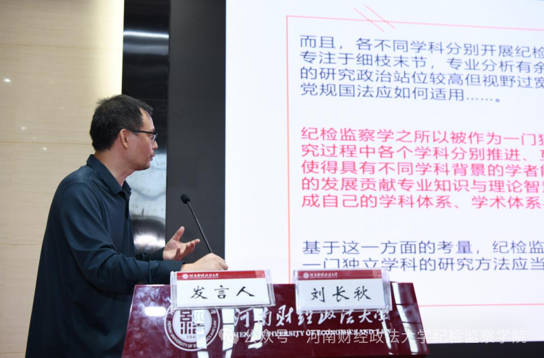上海政法学院纪检监察学院副院长刘长秋教授作题为《纪检监察学研究:特点、方法与展望》的主旨演讲。刘长秋教授表示纪检监察学在学科发展过程中要强化运用跨学科的研究方法、更加关注实践领域的问题、加强党内法规研究,为纪检监察实践提供有力的理论支持。