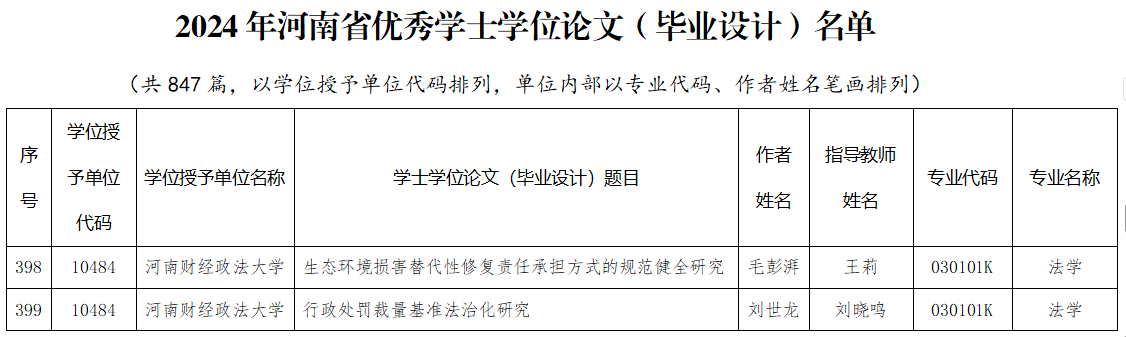 近日,2024年河南省优秀硕、学士学位论文评选结果公布。经个人申报、学校推荐、省教育厅组织专家评议,共有42篇博士学位论文、397篇硕士学位论文和847篇学士学位论文(毕业设计)入选河南省优秀学位论文。法学部有两篇论文获得此项殊荣,占全省法学专业获奖论文总量的五分之一。